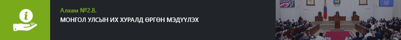 ЗАГВАР №7.2.1. МОНГОЛ УЛСЫГ ХӨГЖҮҮЛЭХ ТАВАН ЖИЛИЙН ҮНДСЭН ЧИГЛЭЛИЙН НИЙГЭМ, ЭДИЙН ЗАСАГ, ЗАСАГЛАЛЫН ХӨГЖИЛД ҮЗҮҮЛСЭН НӨЛӨӨ