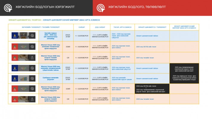 | 1.3. | Засгийн газрын үйл ажиллагааны хөтөлбөрийн төсөл боловсруулах ( Хэрэгжүүлэх арга хэмжээний төлөвлөгөө ) |